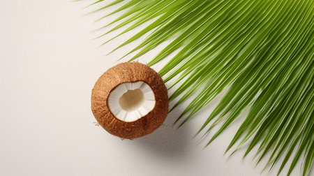 green palm leaf and fresh coconut half on pink background
