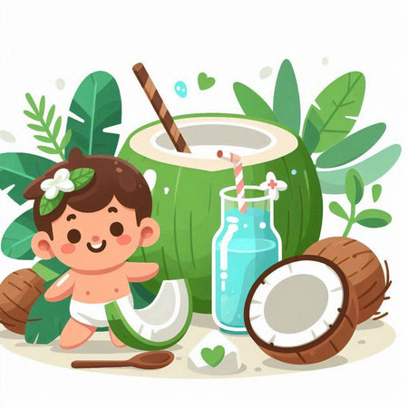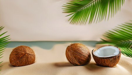 Fresh coconuts and palm leaves creating a tropical and exotic atmosphere. Ai generated image