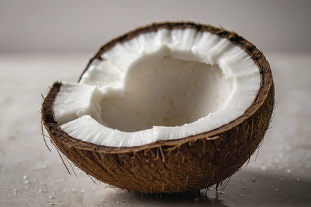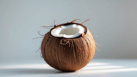 Fresh coconut with a cracked shell displaying its white meat on a light background