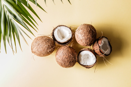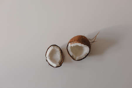 Set from ripe natural organic exotic coconut fruit two whole and one half on a brown background with soft shadows and copy space. Vegan concept. Top view.