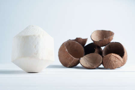 Coconut on a white background. Close-up, selective focus.
