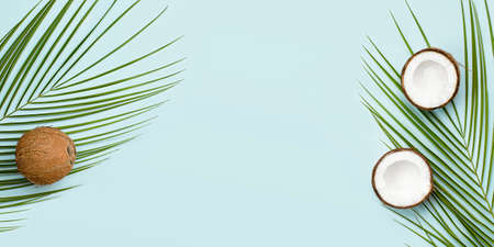 palm leaves and coconut on light blue background
