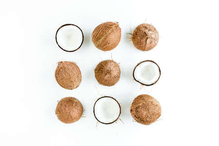 Pattern, texture with coconuts on white background. Tropical abstract background. Flat lay, top view.