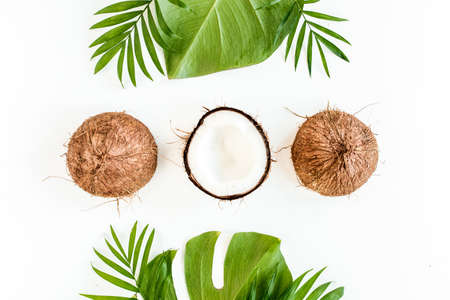 Pattern, frame borders with coconuts and tropical palm leaves on white background. Tropical abstract background. Flat lay, top view.