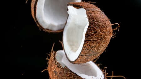 Cracked coconuts falling down on black background.