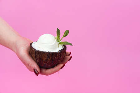 Vanilla ice cream balls in a fresh coconut half, decorated with mint leaves in your hand on a pink background.