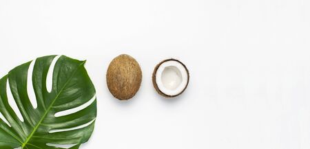 Tropical leaves and fresh coconut on light gray background. Flat lay, top view, copy space. Summer background, nature. Healthy cooking. Creative healthy food concept, half of coconut.