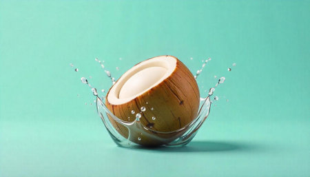 Coconut half splashing in water on a turquoise background