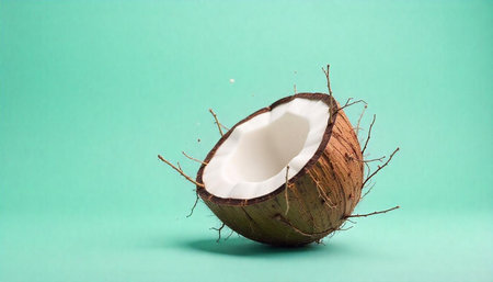 Halved Coconut in Motion Against a Blue-Green Background