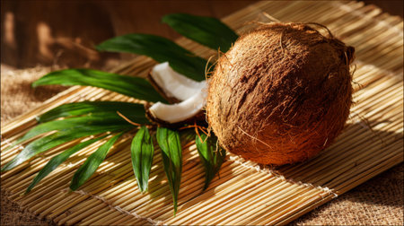 A beautiful arrangement featuring a fresh coconut and palm leaves on a bamboo mat, perfect for showcasing natural ingredients, healthy food options, and tropical vibes.