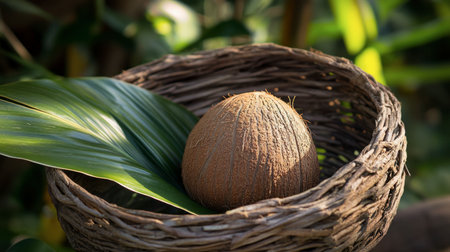 A single ripe coconut nestled in a basket, with a tropical leaf accentuating the natural vibe.