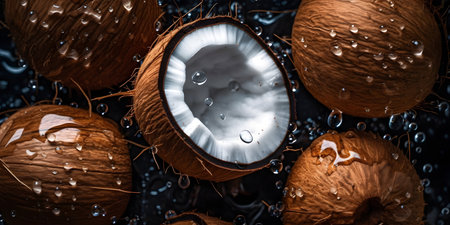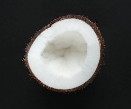 Cracked coconut on a black background with water drops. Top view.