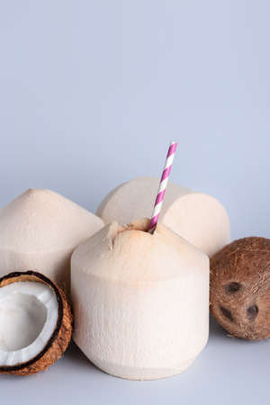 Fresh and ripe coconuts on light background