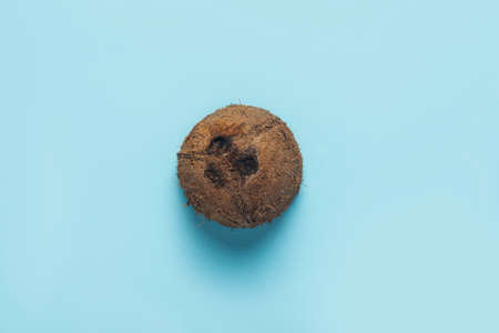 One whole coconut on a blue background. Top view.