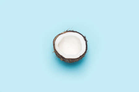 Half of broken coconut on blue background, summer background, tropical fruit minimal concept