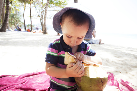Coconut on the sandy beach with palm trees and sea background