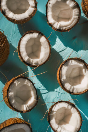 Halved coconuts arranged artistically on a turquoise surface, showcasing their textured interiors and brown shells