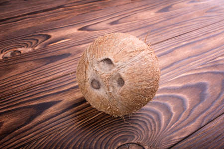 An exotic and tropical coconut on a dark brown wooden background. Close-up of fresh, whole and brown coconut. Top view of organic nut full of vitamins. Hawaiian coconuts. Healthful vegetarian diet.