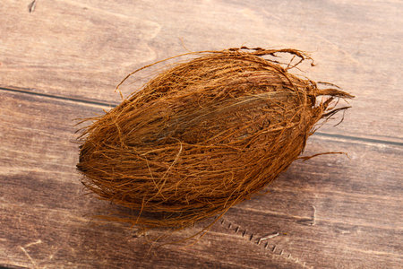 Single hairy hard coconut on wooden surface