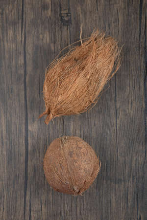 Two hairy hard coconut on wooden surface