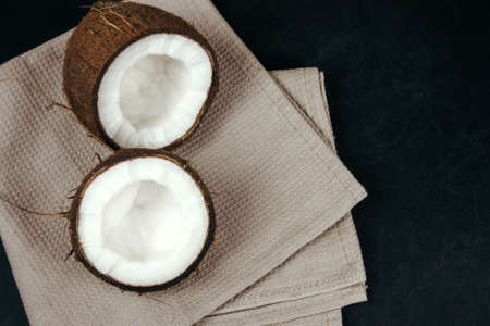 Cracked fresh coconut on white table background. Ripe half cut coconut. Coconut shell, cream and oil. Selective focus. Food ingredients, healthy lifestyle, paradise concept