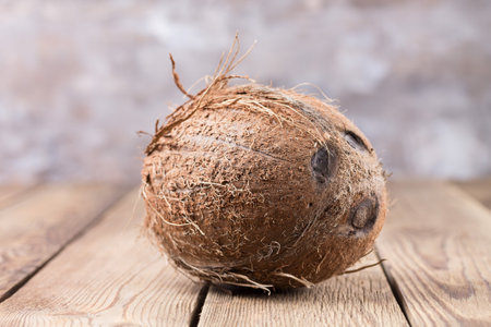 A large coconut lies on a wooden table against a light, blurry background. Healthy food. Closeup
