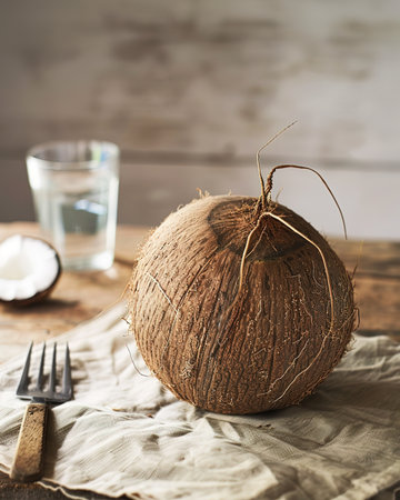 Coconut on a rustic wooden table with a glass of water