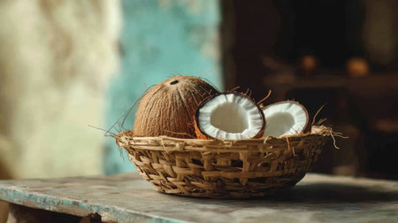 Halved coconut fruit on a wooden table