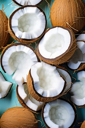 Halved coconuts arranged artistically on a turquoise surface, showcasing their textured interiors and brown shells
