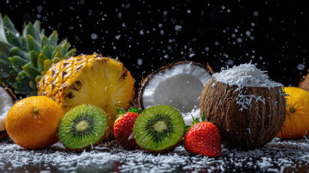 An assortment of colorful fruits is presented with a dark background creating a visually appealing arrangement. The composition features pineapple, coconut, oranges, kiwi and strawberries. The image showcases natural textures and vibrant colors suggesting freshness. Suitable for use in various commercial contexts, including advertising, or illustrative content.