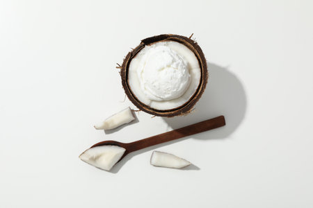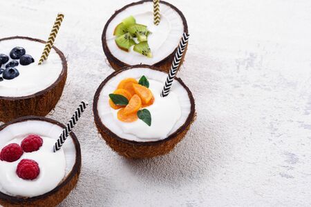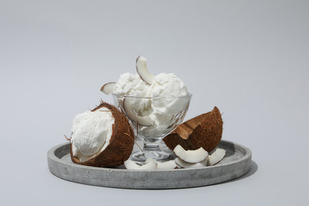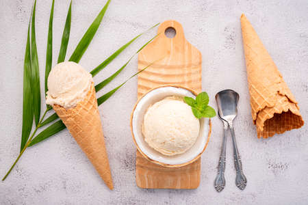 Coconut ice cream flavours in half of coconut setup on white stone background. Summer and Sweet menu concept.