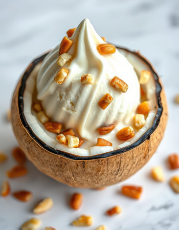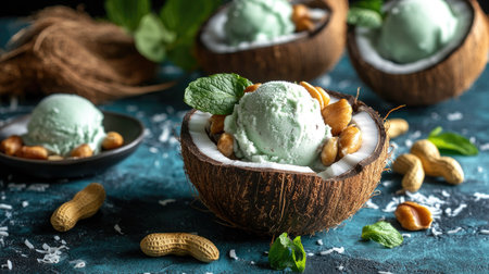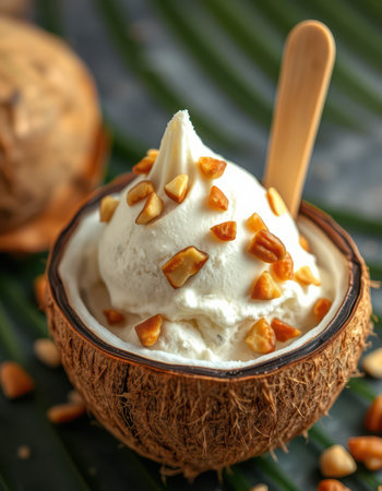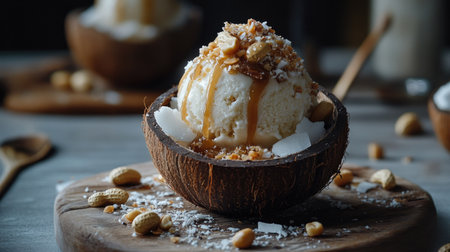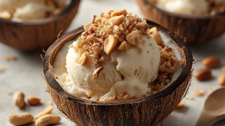 Fresh Thai coconut ice cream in a young coconut shell. Topped with roasted peanuts and diced mango. Concept of tropical desserts, Asian cuisine, exotic flavors, traditional dish
