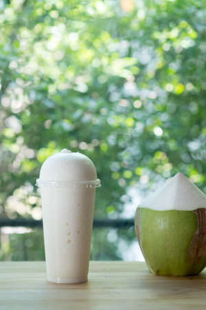 Coconut smoothie in plastic glass, homemade summer drink
