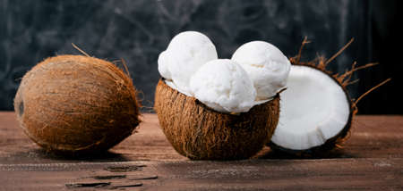 Fresh sweet coconut ice cream in a coconut shell on a wooden table. Sweet summer food.Wide banner.