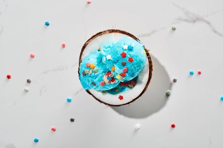 top view of delicious blue ice cream with sprinkles on coconut half on marble grey background