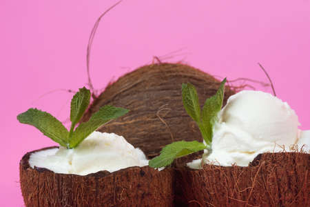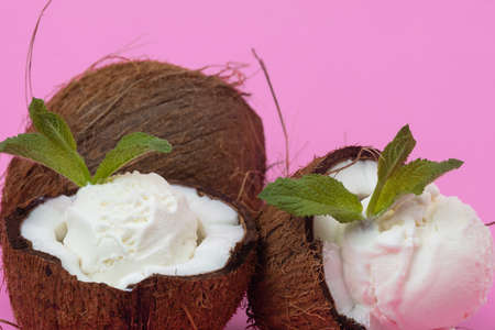 Vanilla ice cream balls in fresh coconut halves decorated with mint leaves on a pink background.