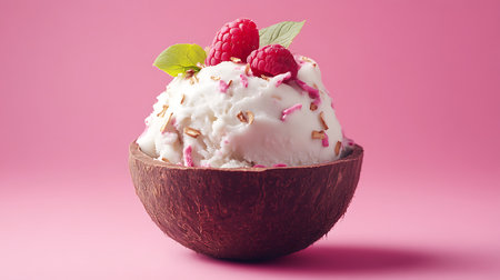 Vanilla ice cream balls in a fresh coconut half decorated with mint leaves with a spoon on a pink background.