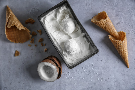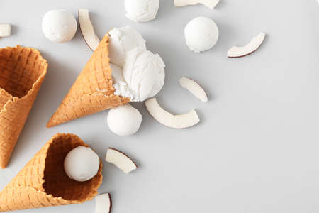 Waffle cones with tasty coconut ice cream on light background
