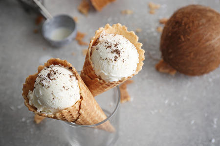 Waffle cones with balls of coconut ice cream in glass on table