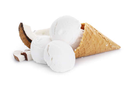 Waffle cone with tasty coconut ice cream on white background