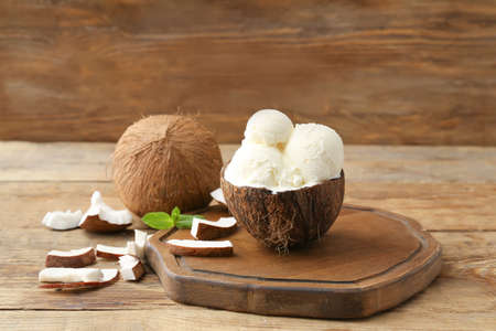 Coconut with tasty ice cream on wooden background