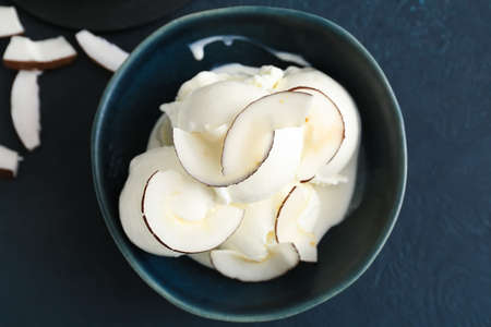 Bowl with tasty coconut ice cream on dark background