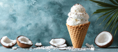 Homemade ice cream in waffle cones, coconuts on the kitchen table, preparing a healthy dessert