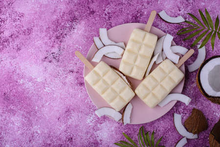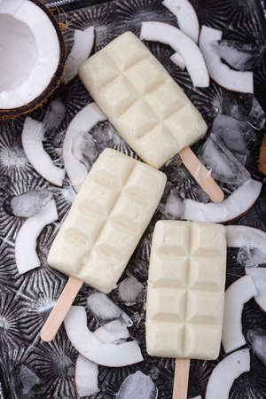 Homemade coconut, ice lolly, on wooden table. Summer food.