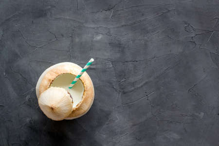 Raw coconut water or milk with straw, above view