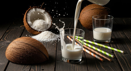 Fresh coconut milk pouring into a glass with a dynamic splash, surrounded by whole and halved coconuts, shredded coconut, and colorful paper straws on a rustic dark wooden surface. vegan, plant based, healthy, tropical drink.