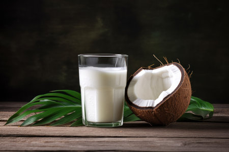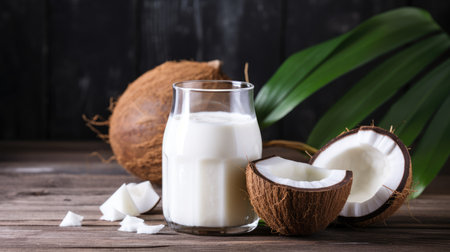 Beautiful close-up of healthy coconut milk on a table, made with generative AI