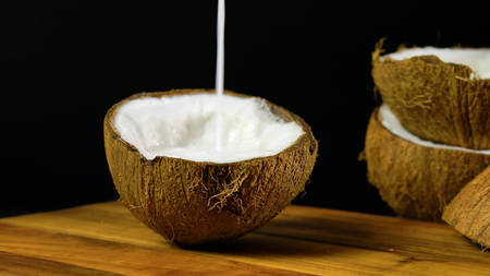 Pouring coconut milk into a half shell against a black background.