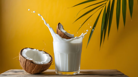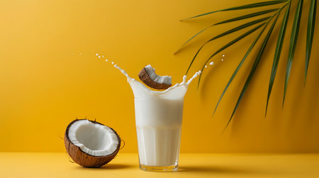 Coconut milk splashing in glass with coconut halves and palm leaf on yellow