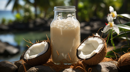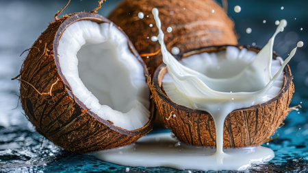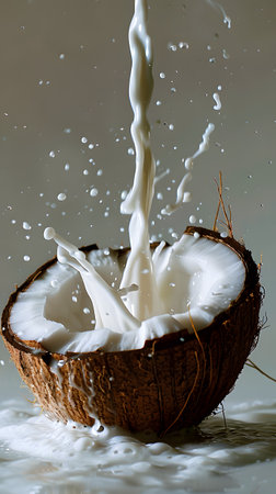 AI Generated. Creamy Coconut Milk Splashing in Coconut Shell